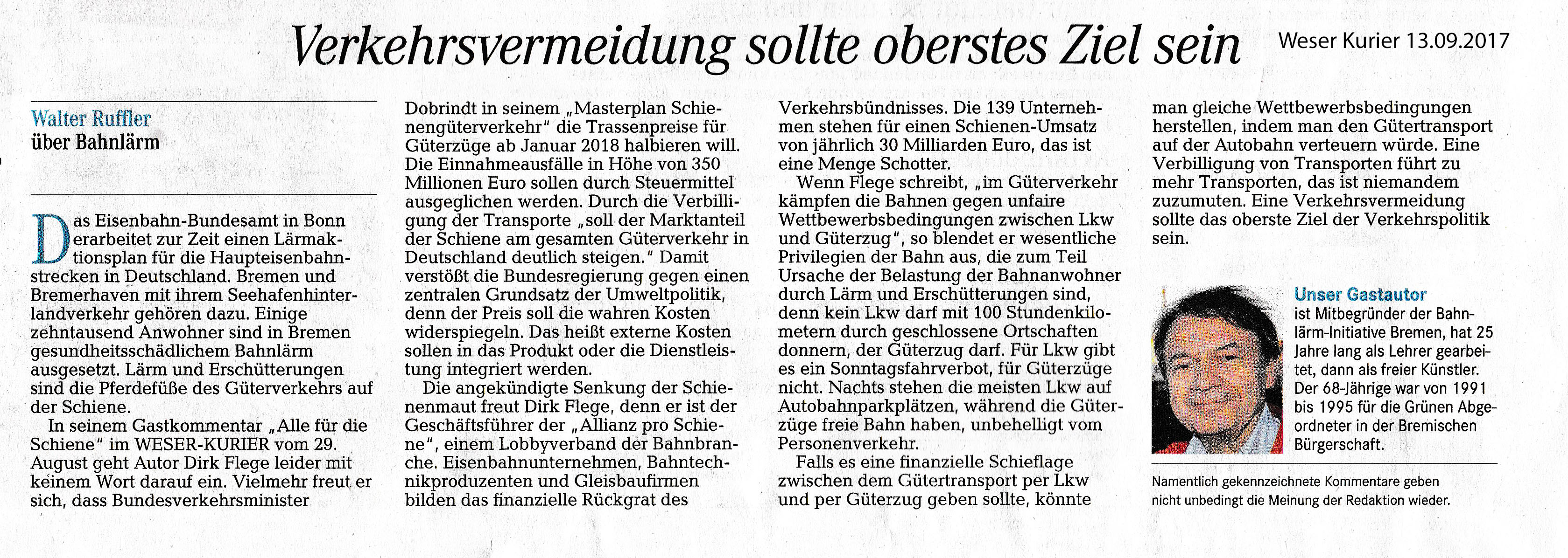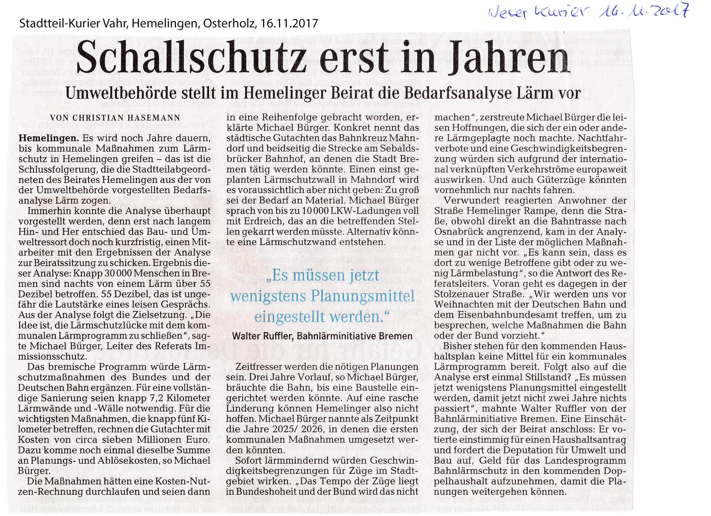23.11.2016: Gastkommentar von Walter Ruffler im Weser Kurier: "Lohse soll sich für Länderbeschluss zum Bahnlärm einsetzen"
